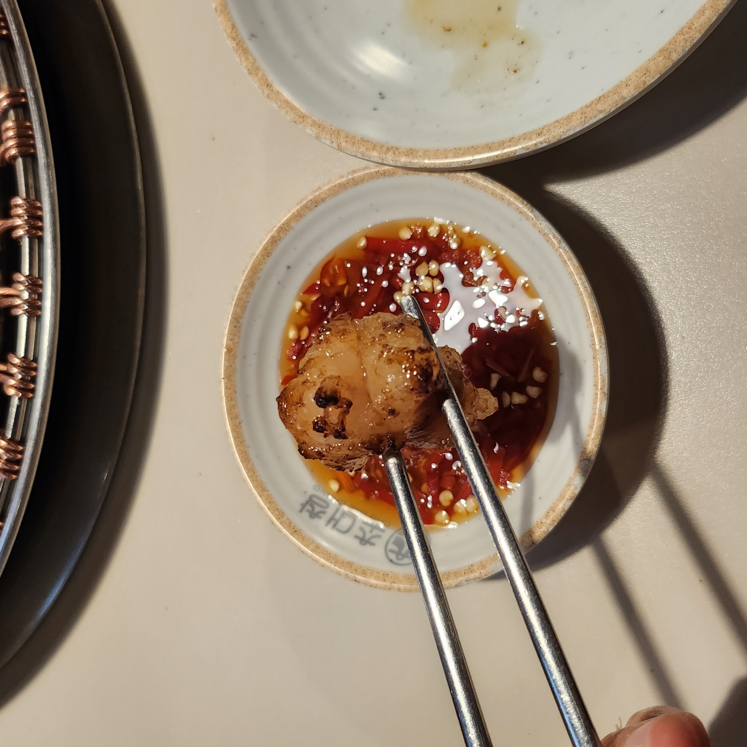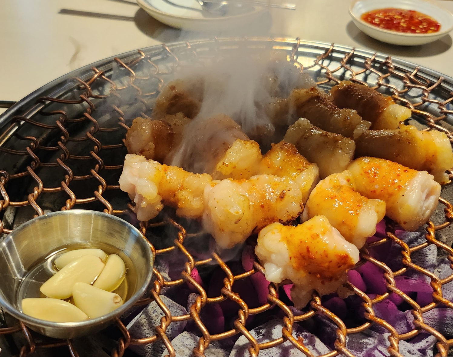 숯불 위에 올려 구웠는데도 곱이 터지지 않았고 대창 본연의 모습 그대로 맛을 느껴볼 수 있었다.